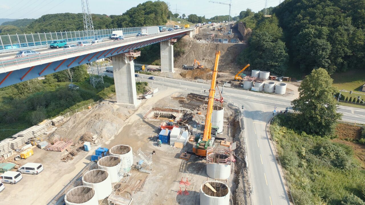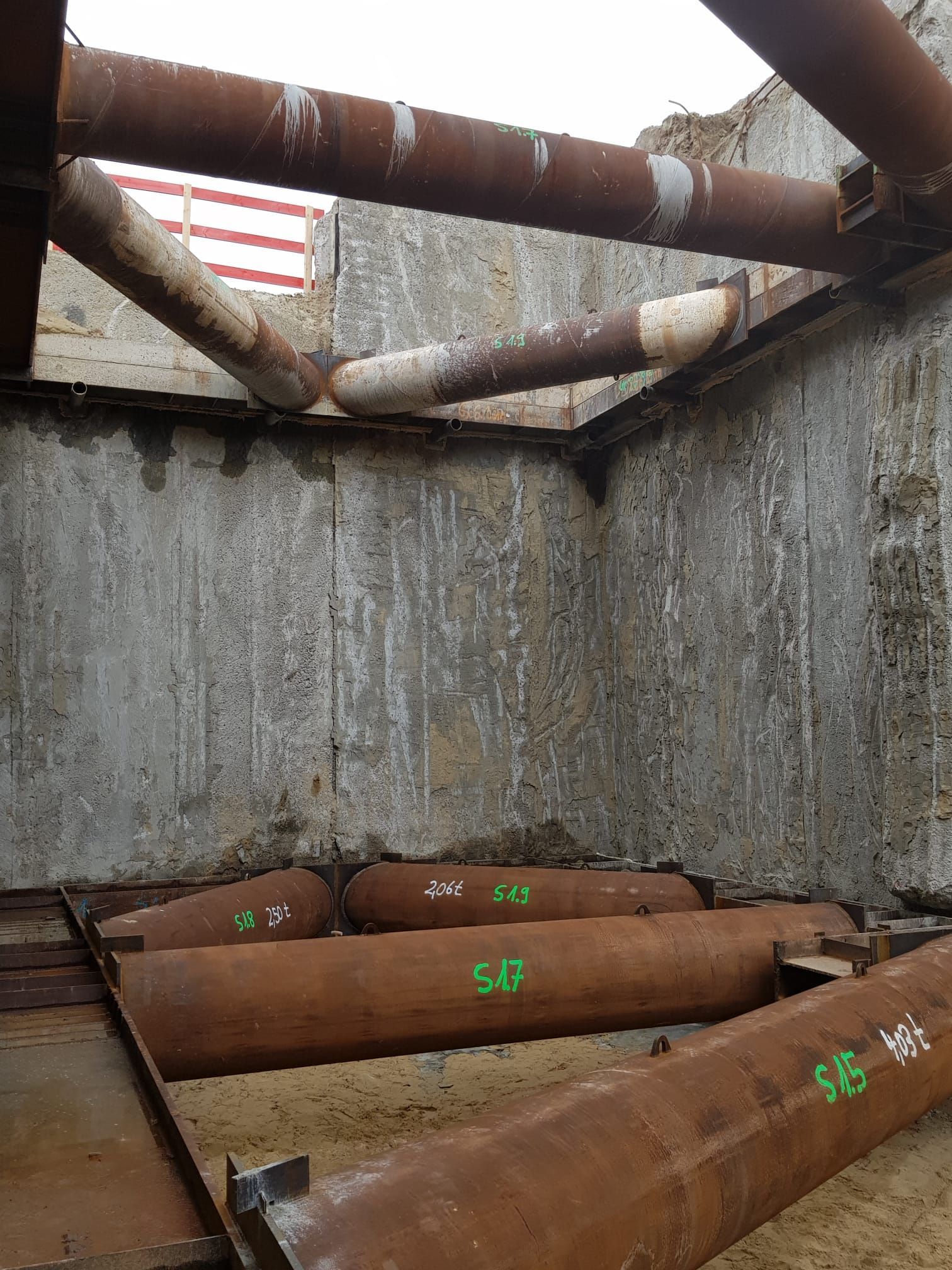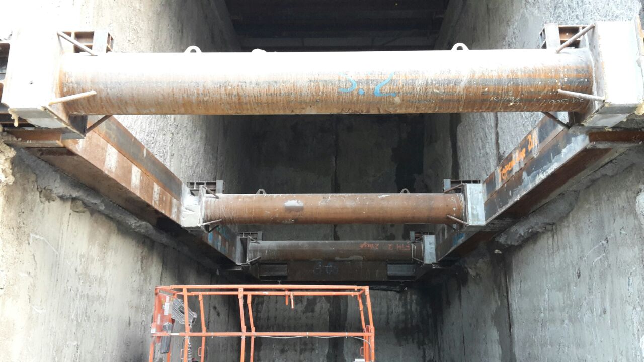 - Schrägabsteifung Kopfbalken herstellen, liefern, einbauen, mit Kapselpressen vorspannen und Rückbauen (Materialeinsatz ~62t)