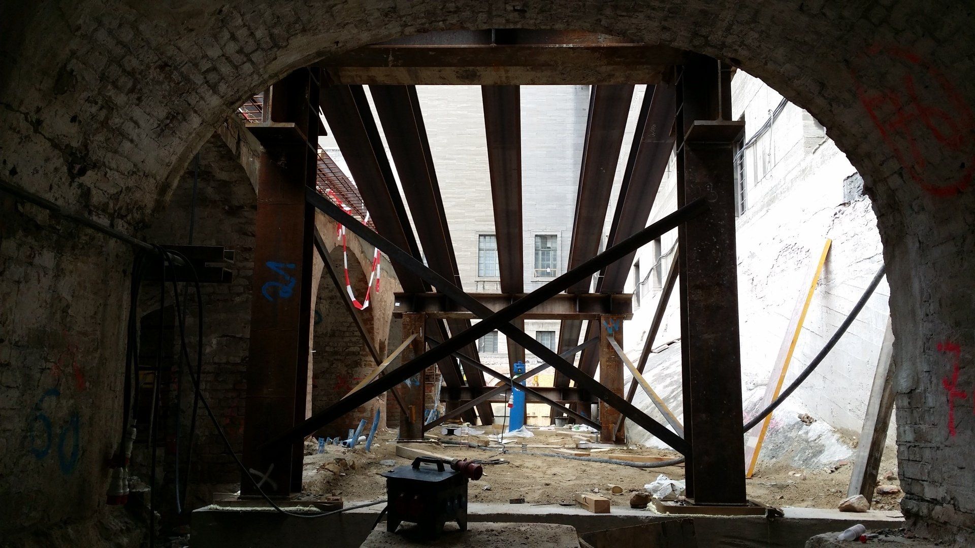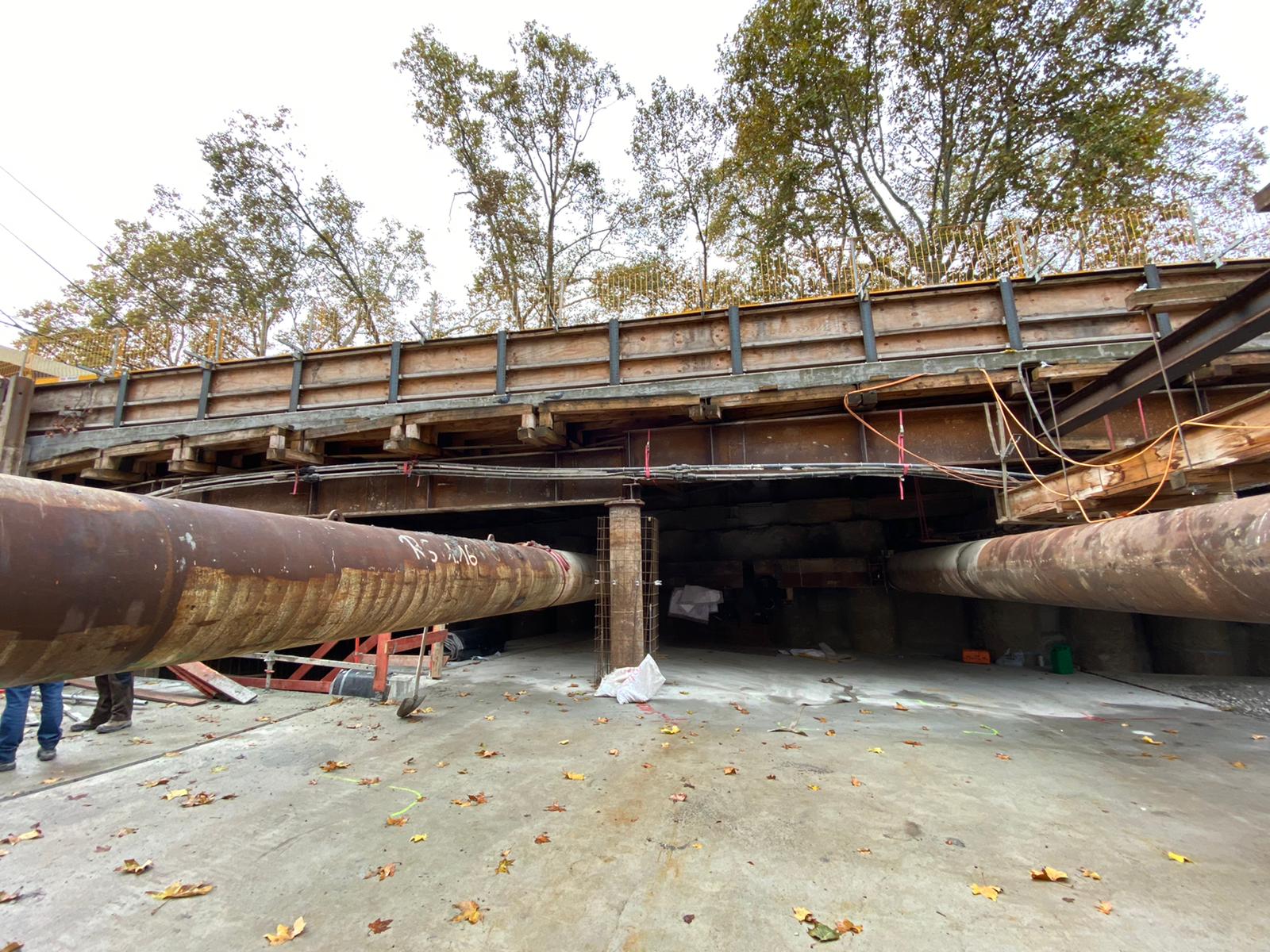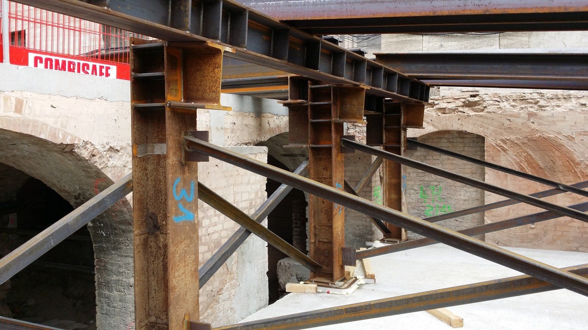 - Schrägabsteifung Kopfbalken herstellen, liefern, einbauen, mit Kapselpressen vorspannen und Rückbauen (Materialeinsatz ~62t)